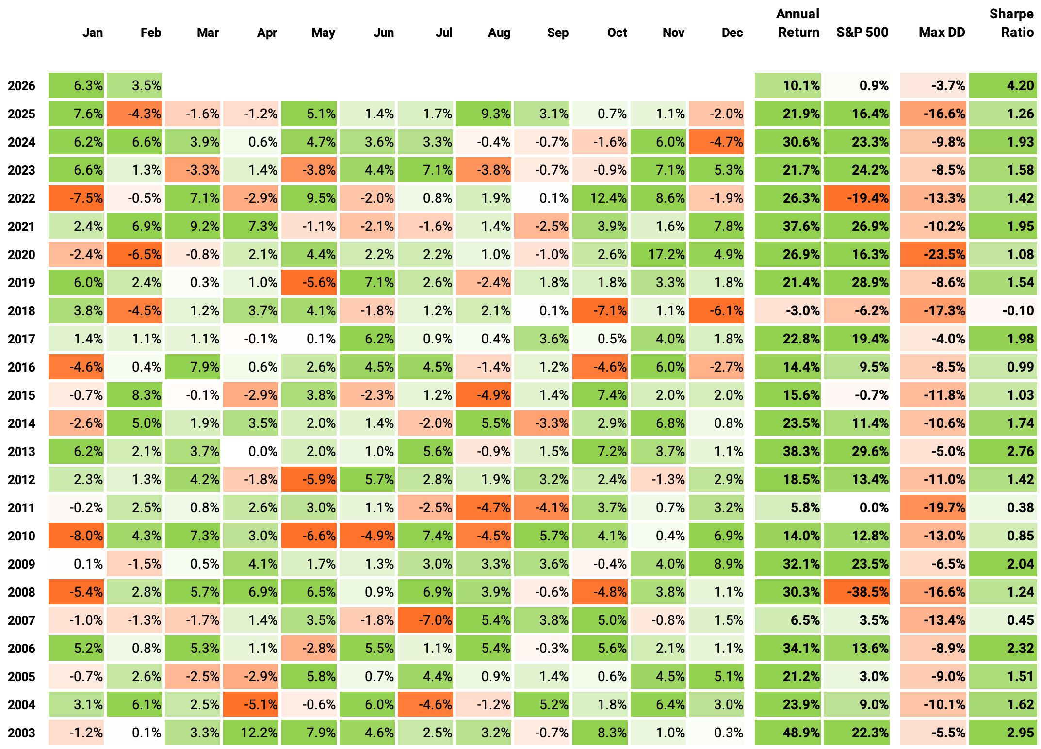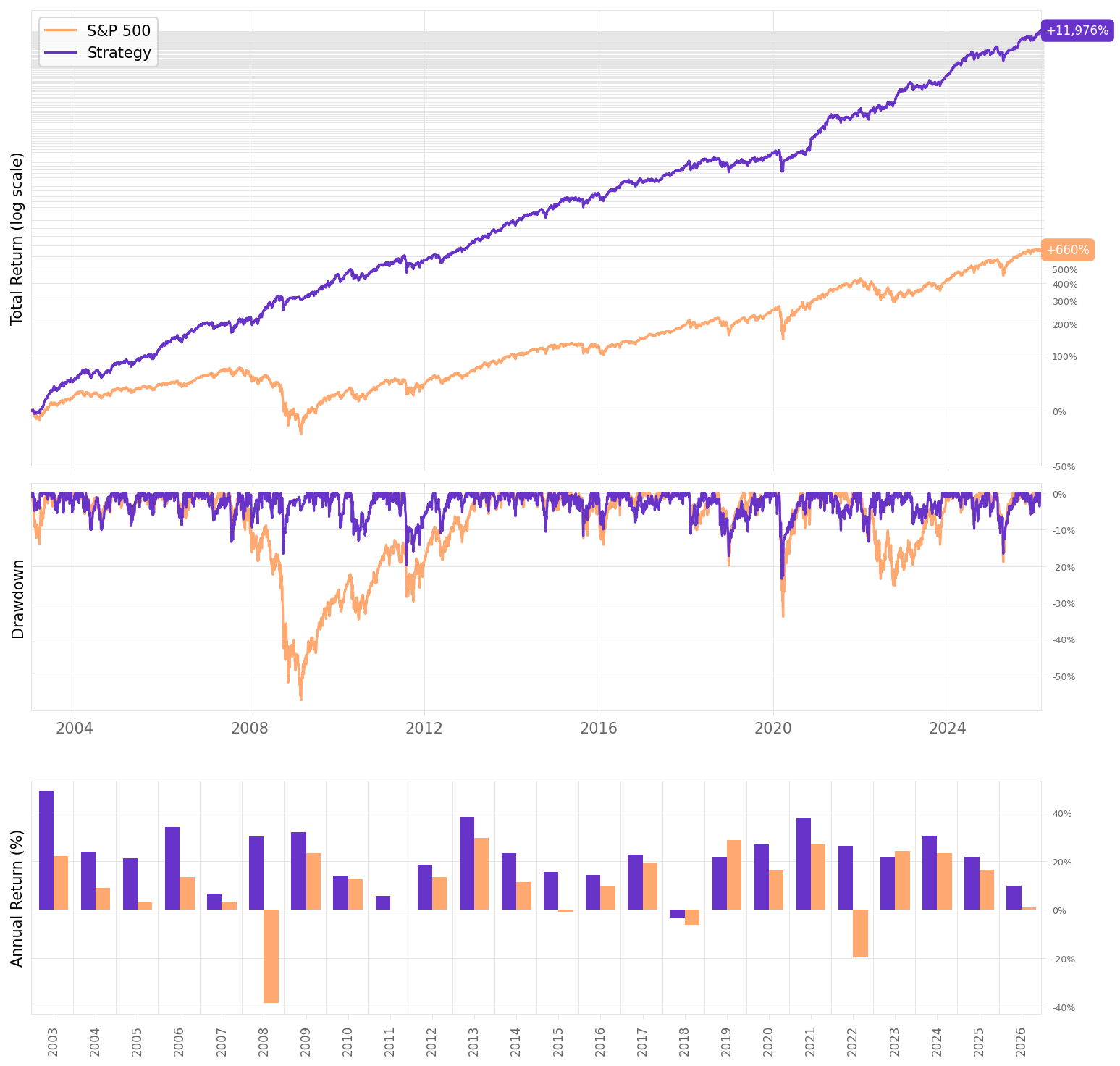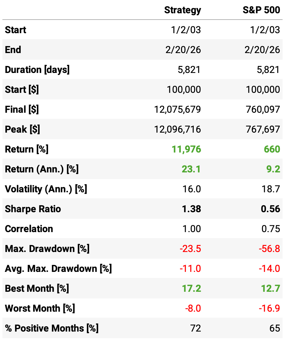 23.1% annualized return — with lower volatility than the benchmark. 16.0% vs 18.7%. More return, less risk. That’s the whole game.