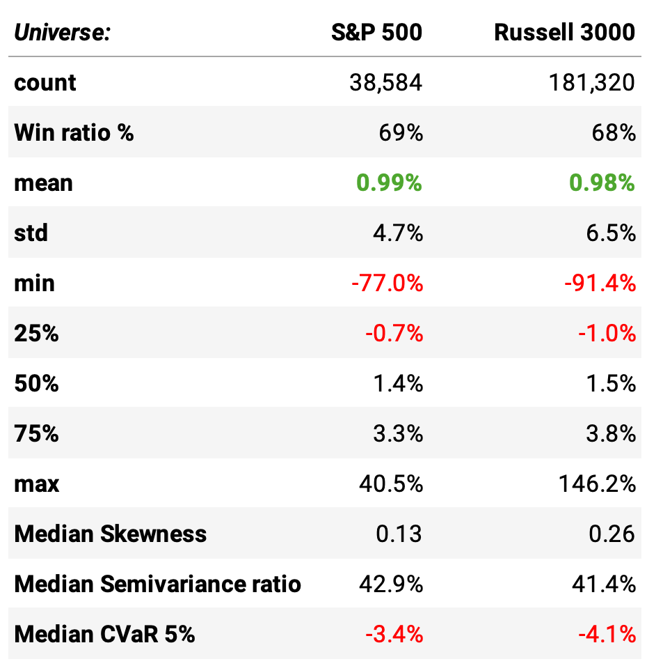 Interestingly, the median skewness and semivariance ratio are actually better in the Russell 3000. The typical name is fine. The problem isn’t the typical name.