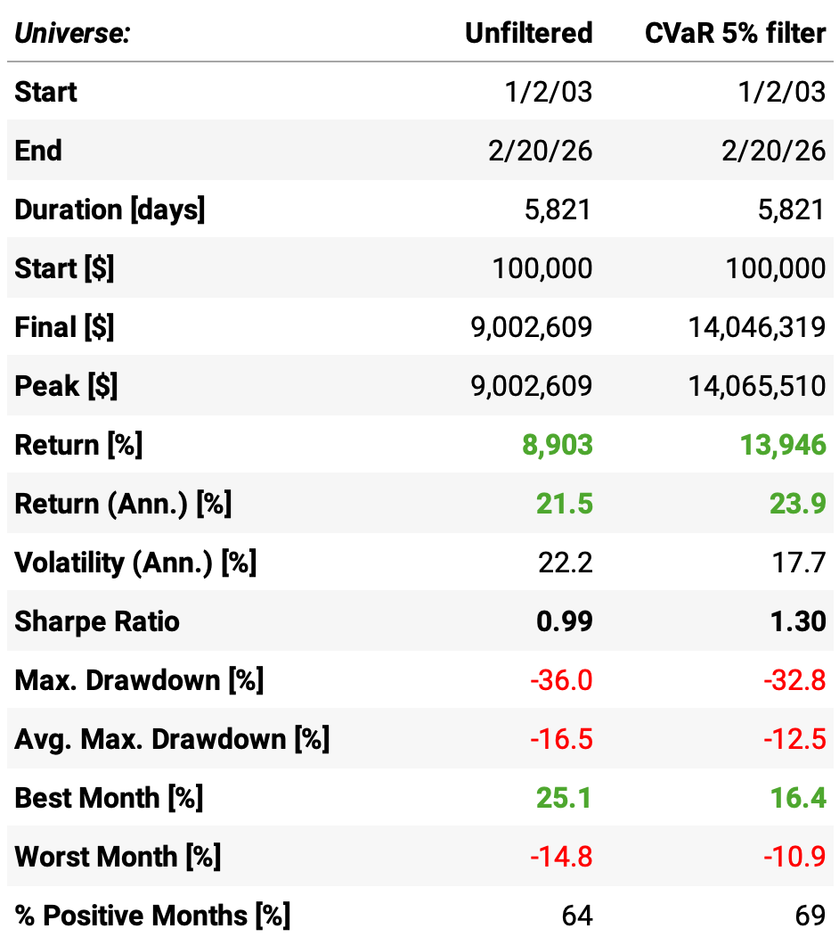 Total return jumps 57%: 13,946% vs 8,903%. Same universe, same signal, same number of positions. The only difference is which names we avoid.