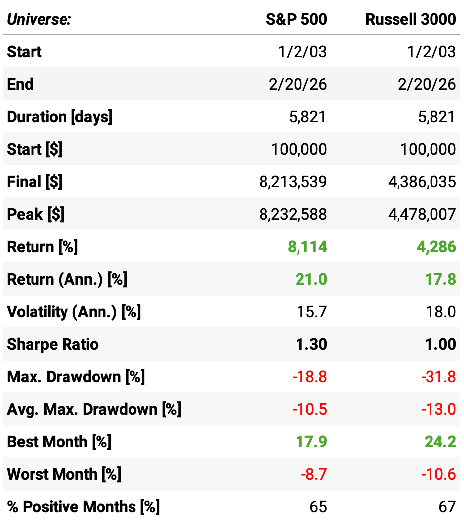 Worst month: -8.0%. Compare that to the benchmark’s -16.9% — or to the unfiltered Russell 3000’s -14.8%. The filter earned its keep.